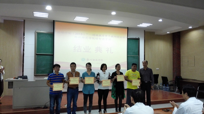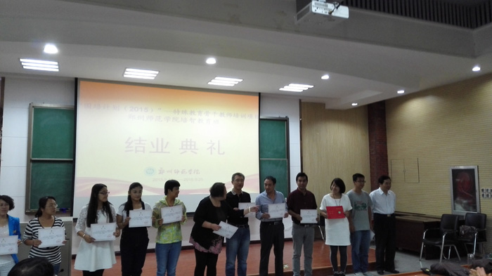 首先,班主任播放了精彩的VCR,张张图片记录了十天培训的点点滴滴。接下来,来自黑龙江省五常市特殊教育学校贾洪生老师代表所有国培参训学员发言,他代表全体学员感谢国培给他们提供的学习机会,感谢郑州师范学院继续教育学院和特殊教育学院对此次培训作出的周密安排,感谢班主任老师为他们付出的辛勤劳动和提供的帮助。