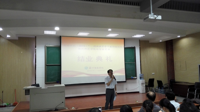 最后,高宏院长讲话,他从此次培训的课程设置,专家聘请,活动安排以及吃住行等方面进行了详细总结,对10天的培训成果给予了高度的肯定。同时也对全体学员提出了期望,希望他们能把在培训中学到的知识运用到自己的教育教学中,为特殊教育事业贡献自己的力量。