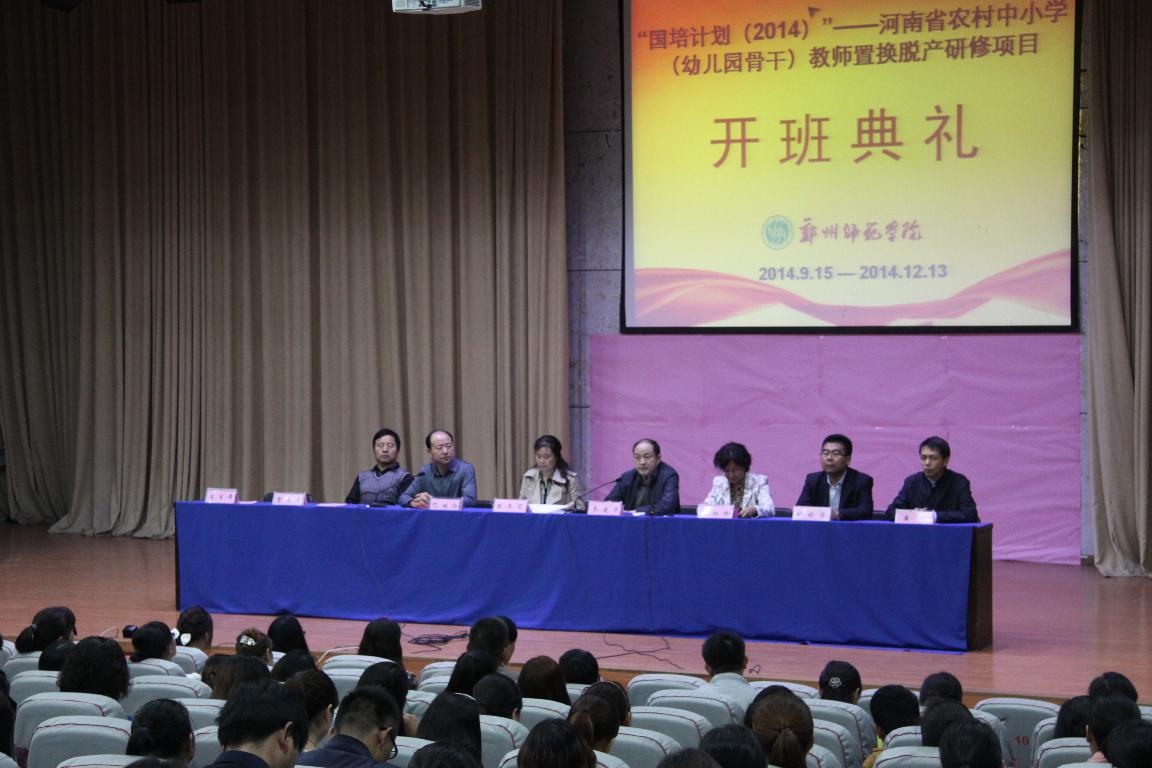 9月16日上午8:00,“国培计划(2014)”——河南省农村中小学(幼儿园骨干)教师置换脱产研修项目在我校开班。郑州师范学院继续教育学院党总支书记巴继伦、院长乔建华与涉及到的五个院系院长及500多名学员参加了开班典礼。典礼由巴继伦书记主持。