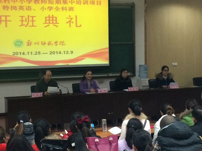 11月26日,“国培计划(2014)”——河南省农村中小学教师短期集中培训项目特岗英语班、小学全科班在我校东校区经管楼报告厅开班。继续教育学院党总支书记巴继伦、外国语学院院长张梦、初等教育学院院长陈冬花及来自全省的近200余学员参加了开班典礼。开班典礼由继续教育学院党总支书记巴继伦主持。