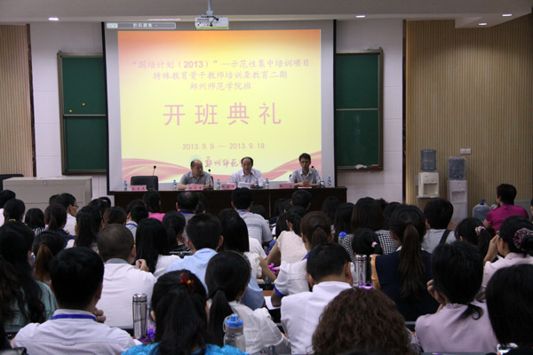 9月10日上午,“国培计划(2013)”—示范性集中培训项目特殊教育骨干教师聋教育二期开班在我校东校区经管楼一楼报告厅举行。郑州师范学院特殊教育学院杜志强院长、继续教育学院乔健华院长以及来自全国的153名学员出席了开班典礼,典礼由继续教育学院黄光副院长主持。