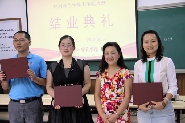 9月11日上午,“国培计划(2013)”—河南省农村中小学教师短期集中培训项目小学英语班结业典礼在外国语教学楼A108教室举行。为期十五天的小学英语班培训至此落下帷幕,郑州师范学院外国语学院张梦院长、继续教育学院乔建华院长及48名学员参加了典礼。