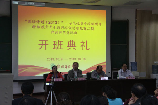 10月10日上午,我校承办的“国培计划(2013)”—示范性集中培训项目特殊教育骨干教师培智教育二期在经管楼报告厅隆重开班。郑州师范学院继续教育学院巴继伦书记、乔健华院长、特殊教育学院杜志强院长及来自全国148名学员及相关部门负责人参加了典礼,开班典礼由巴继伦书记主持。
