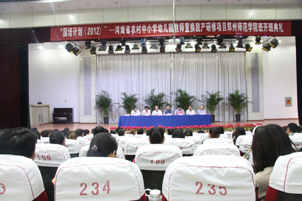 9月12日上午9:00,“国培计划(2012)”——河南省农村中小学教师脱产置换研修班在我校开班。河南省教育厅师范处副处长杨永盛,郑州师范学院副校长赵玉玲、继续教育学院党总支书记巴继伦、文学院党总支书记李坤陶、教育科学学院党总支书记乔春平、特殊教育学院党总支书记李杰、数学与统计学院副院长荆自体以及500多名学员参加了开班典礼。典礼由巴继伦书记主持。