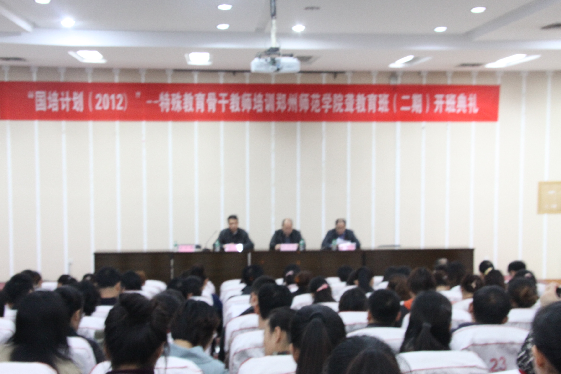 10月26日上午8:30,“国培计划(2012)”——示范性集中培训项目特殊教育骨干教师培训郑州师范学院聋教育(二期)在我校开班。继续教育学院院长乔建华、特殊教育学院院长杜志强、继续教育学院副院长黄光及100名学员参加了开班典礼,典礼由黄光副院长主持。