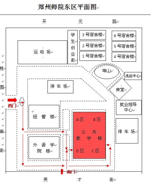 建议开车的学员到文化路与开元路交叉口向东转,行驶100米,从学院北门进入。(7:00—8:30南门禁止机动车辆进入)